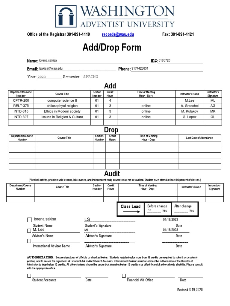 Add Drop Form PDF Academia Students