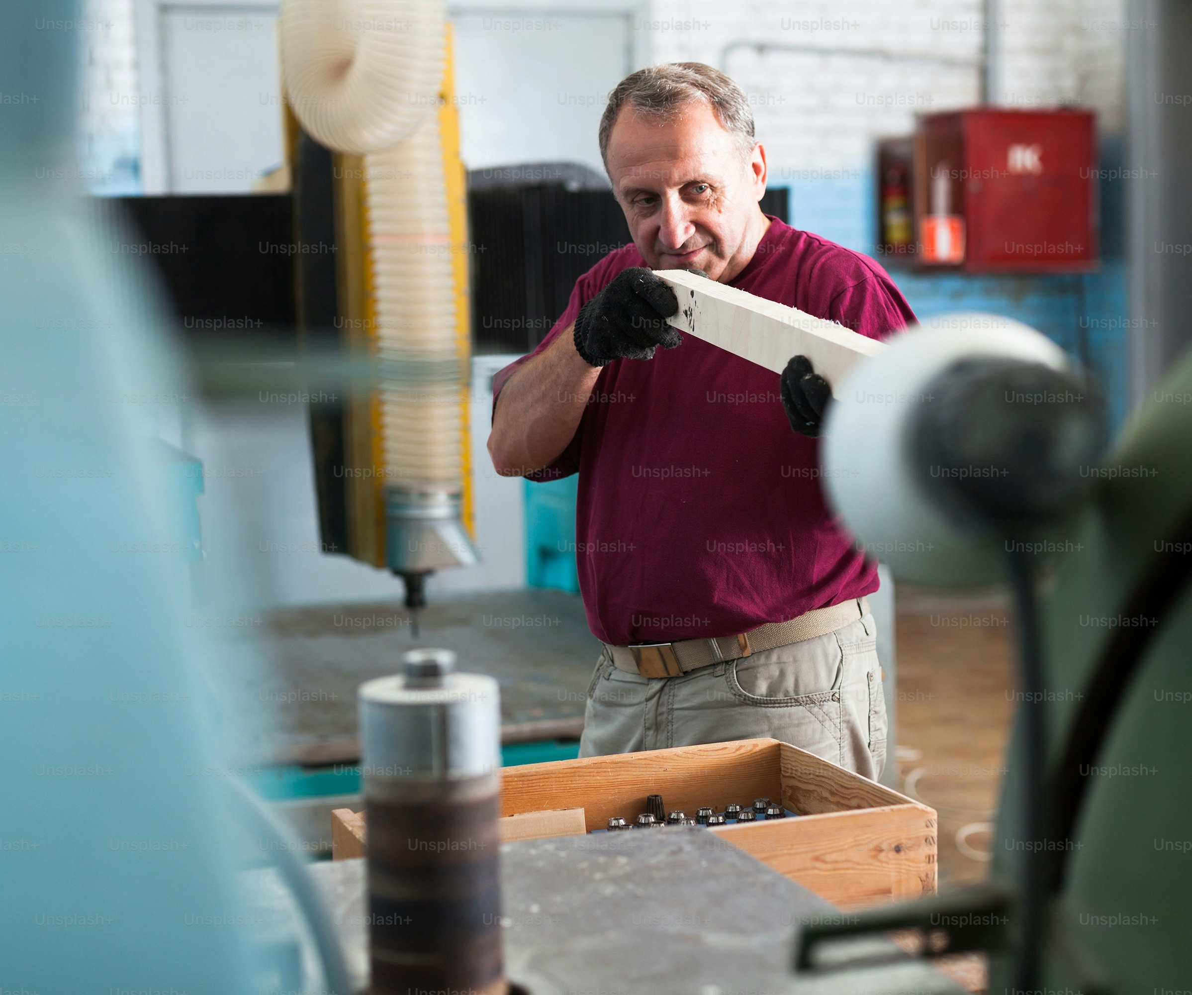 Un trabajador concentrado está dando forma a la madera en una máquina